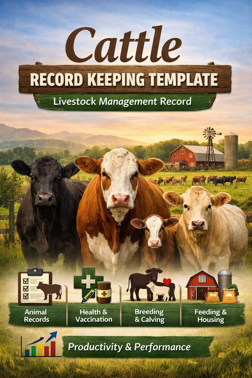 A practical and easy-to-use cattle record-keeping template designed to help farmers and livestock managers track animal identification, health, breeding, feeding, and performance for better decision-making and improved herd productivity.